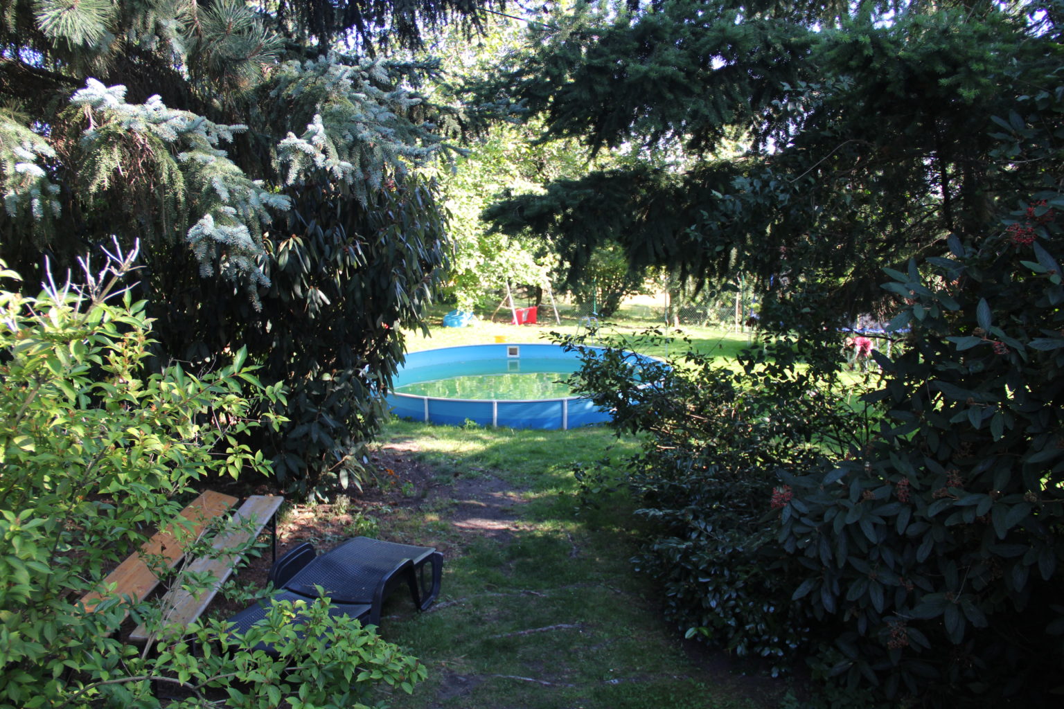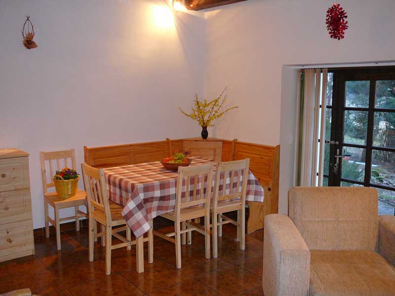 je ložnice se třemi lůžky, kde je možné dát i dětskou postýlku, samostatné WC a koupelna. Zařízená kuchyňka spojena s obývacím pokojem, krbem a 'francouzským oknem', kterým se vchází na terasu s pergolou a do zahrady s bazénem a dětským koutkem, trampolínou a houpačkami. Zde se nabízí krásný, uklidňující pohled na panorama Českého středohoří.